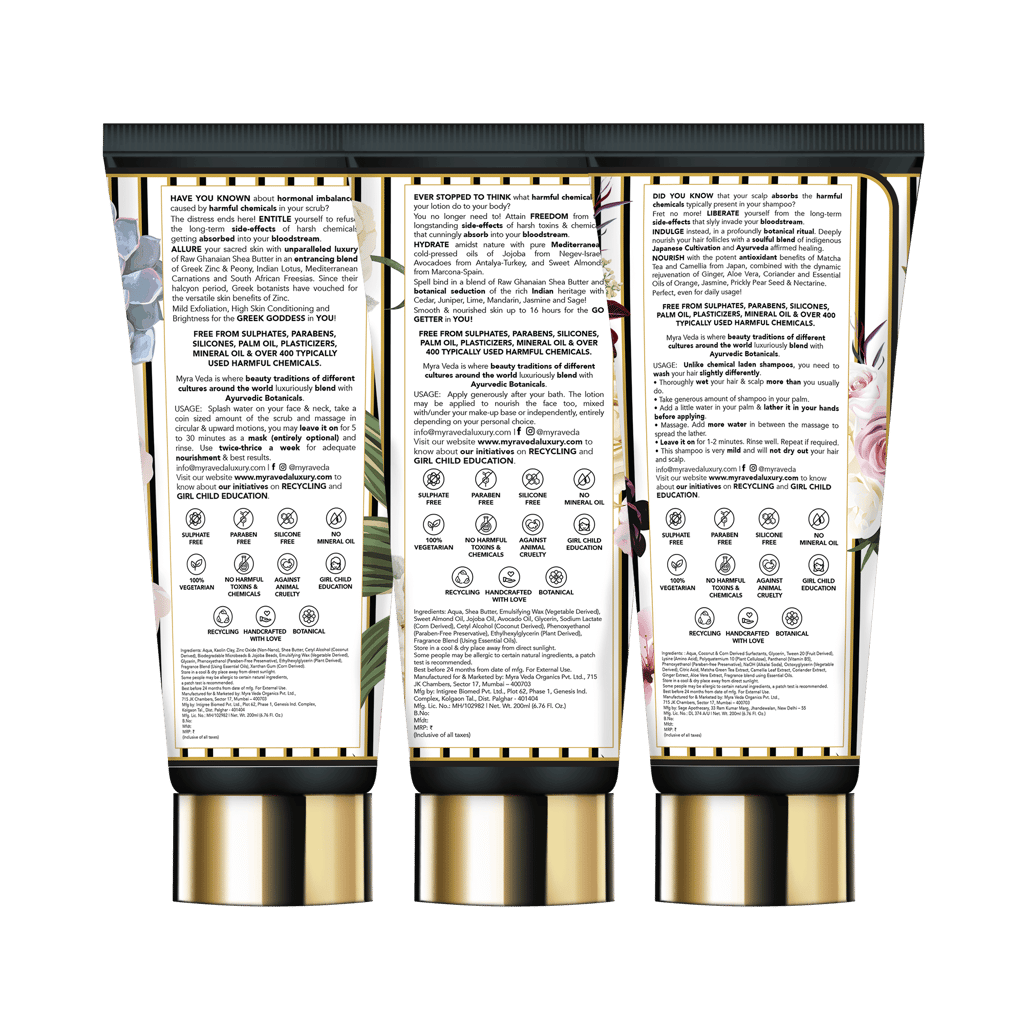 Ingredients:The Greek Goddess :-Aqua, Kaolin Clay, Zinc Oxide (Non-Nano), Shea Butter, Cetyl Alcohol(Coconut Derived), Biodegradable Microbeads & Jojoba Beads, Emulsifying Wax ( Vegetable Derived), Glycerin, Phenoxyethanol (Paraben-Free Preservative), Ethylhexylglycerin (Plant Derived), Fragrance Blend (Using Essential Oils), Xanthan Gum (corn Derived) + Mediterranean White Sage Hand & Body Lotion :-Aqua, Shea Butter, Emulsifying Wax(Vegetable Derived), Sweet Almond Oil, Jojoba Oil, Avocado Oil, Glycerin, Sodium Lactate (com Derived), Cetyl Alcohol (Coconut Derived), Phenoxyethanol(Paraben-Free Preservative), Ethylhexylglycerin(Plant Derived), Fragrance Blend (Using Essential Oils). + Japanese Matcha Tea & Camellia Restorative Shampoo :- Aqua, Coconut & Corn Derived, Surfactants, Glycerin, Tween 20(Fruit Derived), Lysine(Amino Acid), Polyquaternium 10 (Plant Cellulose), Panthenol (Vitamin B5), Phenoxyethanol (paraben-free Preservative), NaOH (Alkalai Soda), Octoxyglycerin (Vegetable Derived), Citric Acid, Matcha Green Tea Extract, Aloe Vera Extract, Fragrance blend using Essential Oils.The Greek Goddess :-Aqua, Kaolin Clay, Zinc Oxide (Non-Nano), Shea Butter, Cetyl Alcohol(Coconut Derived), Biodegradable Microbeads & Jojoba Beads, Emulsifying Wax ( Vegetable Derived), Glycerin, Phenoxyethanol (Paraben-Free Preservative), Ethylhexylglycerin (Plant Derived), Fragrance Blend (Using Essential Oils), Xanthan Gum (corn Derived) + Mediterranean White Sage Hand & Body Lotion :-Aqua, Shea Butter, Emulsifying Wax(Vegetable Derived), Sweet Almond Oil, Jojoba Oil, Avocado Oil, Glycerin, Sodium Lactate (com Derived), Cetyl Alcohol (Coconut Derived), Phenoxyethanol(Paraben-Free Preservative), Ethylhexylglycerin(Plant Derived), Fragrance Blend (Using Essential Oils). + Japanese Matcha Tea & Camellia Restorative Shampoo :- Aqua, Coconut & Corn Derived, Surfactants, Glycerin, Tween 20(Fruit Derived), Lysine(Amino Acid), Polyquaternium 10 (Plant Cellulose), Panthenol (Vitamin B5), Phenoxyethanol (paraben-free Preservative), NaOH (Alkalai Soda), Octoxyglycerin (Vegetable Derived), Citric Acid, Matcha Green Tea Extract, Aloe Vera Extract, Fragrance blend using Essential Oils.