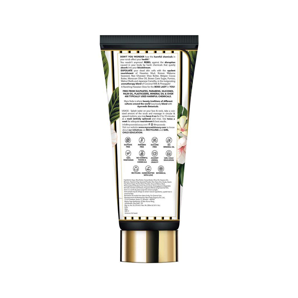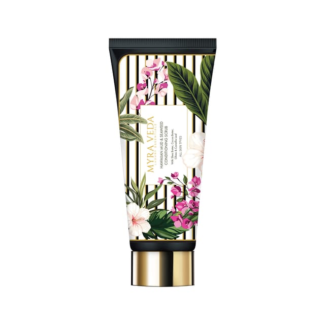 Our Hawaiian mud and Seaweed scrub, an intensely nourishing formula, bestows deep cleansing exfoliation leaving the skin feeling revitalized, softer, smoother, brighter, and generously glowing. Incorporation of three very strong topical natural exfoliators- pumice stone powder, walnut shells and brown sugar help in getting rid of old and dead skin cells, dirt, oil and environmental residue contributing to a flawless radiance and a younger-looking skin.