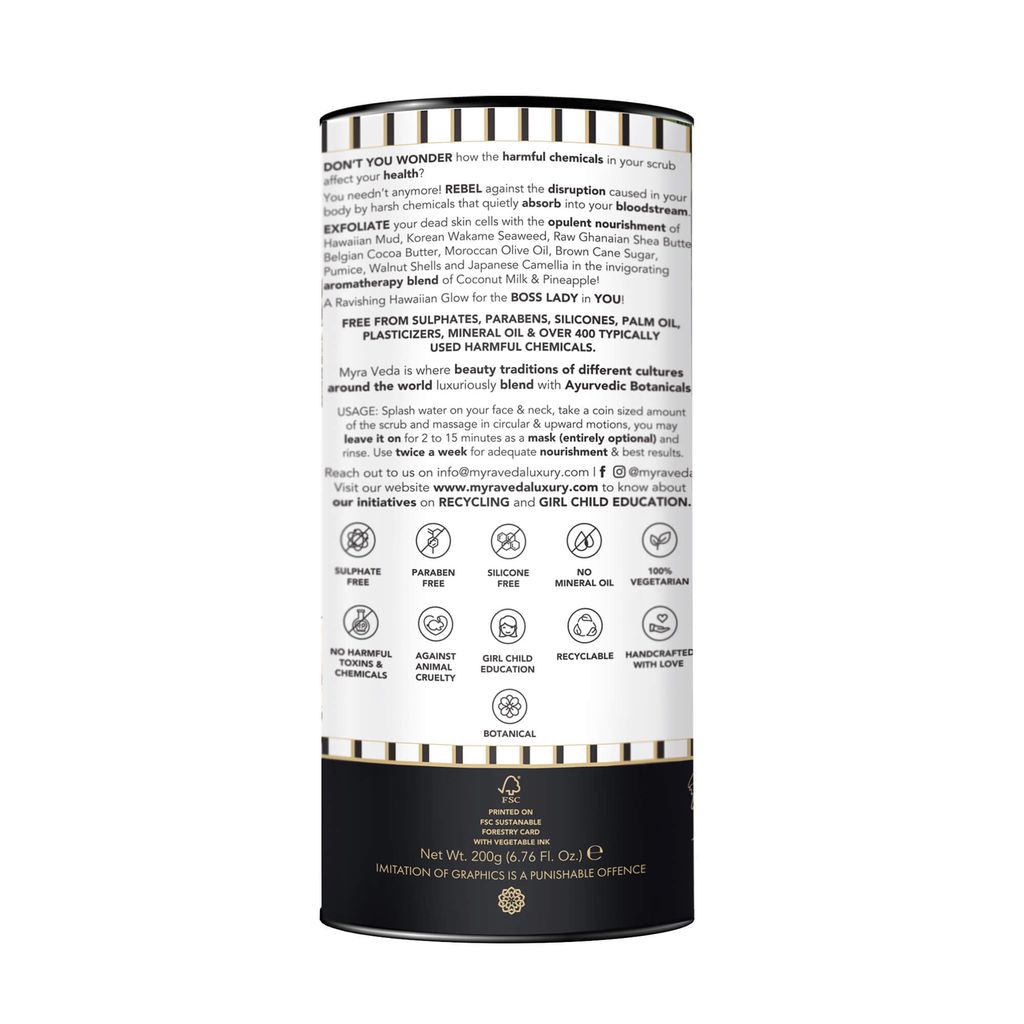 Our Hawaiian mud and Seaweed scrub, an intensely nourishing formula, bestows deep cleansing exfoliation leaving the skin feeling revitalized, softer, smoother, brighter, and generously glowing. Incorporation of three very strong topical natural exfoliators- pumice stone powder, walnut shells and brown sugar help in getting rid of old and dead skin cells, dirt, oil and environmental residue contributing to a flawless radiance and a younger-looking skin.