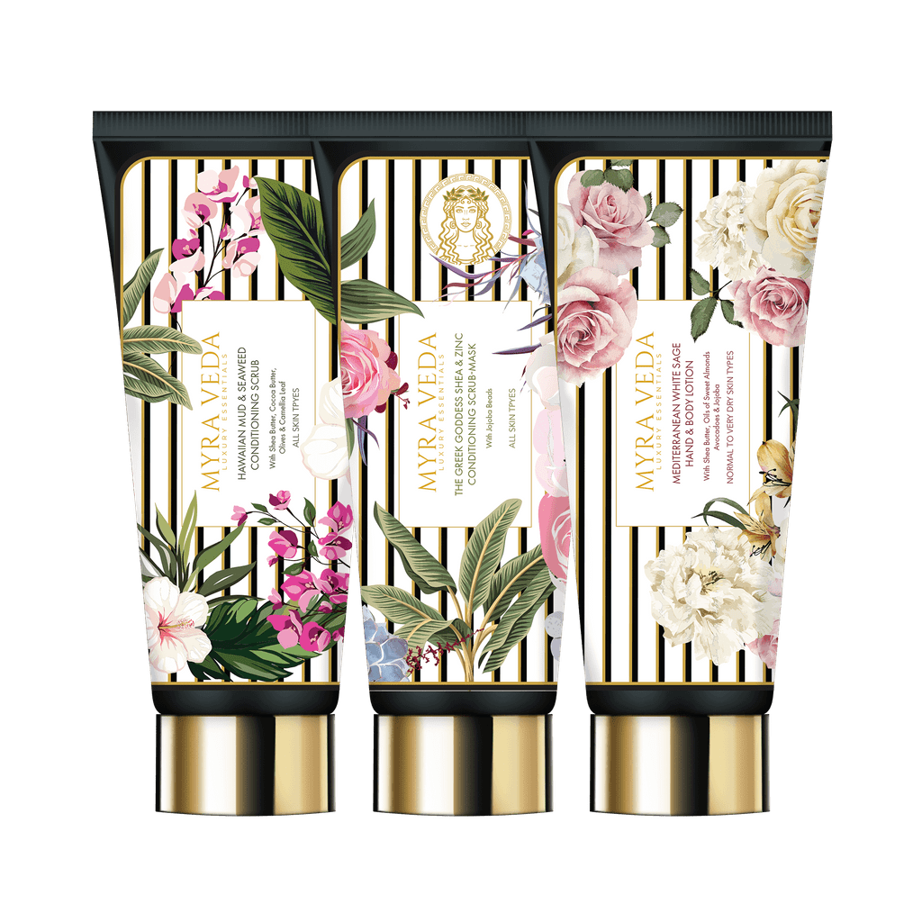 Ingredients:Hawaiian Mud & Seaweed Scrub :- Aqua, Shea Butter, Cocoa Butter, Olive Oil, Sesame Oil, Beeswax, Hawaiian Clay, Seaweed Powder, Non-Nano Zinc Oxide, Kaolin Clay, Brown Sugar, Pumice Stone Powder, Ground Walnut shell, Phenoxyethanol (Paraben-Free Preservative), Octoxyglycerin (Vegetable Derived), Camellia Leaf Extract, Fragrance Blend using Essential Oils. + Mediterranean White Sage Hand & Body Lotion :-Aqua, Shea Butter, Emulsifying Wax(Vegetable Derived), Sweet Almond Oil, Jojoba Oil, Avocado Oil, Glycerin, Sodium Lactate (com Derived), Cetyl Alcohol (Coconut Derived), Phenoxyethanol(Paraben-Free Preservative), Ethylhexylglycerin(Plant Derived), Fragrance Blend (Using Essential Oils). + The Greek Goddess Shea & Zinc Scrub-Mask : Aqua, Kaolin Clay, Zinc Oxide (Non-Nano), Shea Butter, Cetyl Alcohol(Coconut Derived), Biodegradable Microbeads & Jojoba Beads, Emulsifying Wax ( Vegetable Derived), Glycerin, Phenoxyethanol (Paraben-Free Preservative), Ethylhexylglycerin (Plant Derived), Fragrance Blend (Using Essential Oils), Xanthan Gum (corn Derived)Hawaiian Mud & Seaweed Scrub :- Aqua, Shea Butter, Cocoa Butter, Olive Oil, Sesame Oil, Beeswax, Hawaiian Clay, Seaweed Powder, Non-Nano Zinc Oxide, Kaolin Clay, Brown Sugar, Pumice Stone Powder, Ground Walnut shell, Phenoxyethanol (Paraben-Free Preservative), Octoxyglycerin (Vegetable Derived), Camellia Leaf Extract, Fragrance Blend using Essential Oils. + Mediterranean White Sage Hand & Body Lotion :-Aqua, Shea Butter, Emulsifying Wax(Vegetable Derived), Sweet Almond Oil, Jojoba Oil, Avocado Oil, Glycerin, Sodium Lactate (com Derived), Cetyl Alcohol (Coconut Derived), Phenoxyethanol(Paraben-Free Preservative), Ethylhexylglycerin(Plant Derived), Fragrance Blend (Using Essential Oils). + The Greek Goddess Shea & Zinc Scrub-Mask : Aqua, Kaolin Clay, Zinc Oxide (Non-Nano), Shea Butter, Cetyl Alcohol(Coconut Derived), Biodegradable Microbeads & Jojoba Beads, Emulsifying Wax ( Vegetable Derived), Glycerin, Phenoxyethanol (Paraben-Free Preservative), Ethylhexylglycerin (Plant Derived), Fragrance Blend (Using Essential Oils), Xanthan Gum (corn Derived)